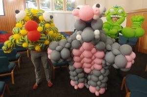 Aside from the eight programs, I did a few elaborate costumes and an entranceway arch to help draw people in to the main event. We had students walking around in a full-body hippo costume, a giant fish, and as an amazing, bulky, superhero. Outside the door, we had a pumpkin-themed arch to help people spot the place where the action was happening. When the church told the local news station about all the exciting things we were doing, they wanted to interview me on a live morning show! I had the opportunity to share Inflatable Stories for almost ten minutes on the local news and invite people to the event.